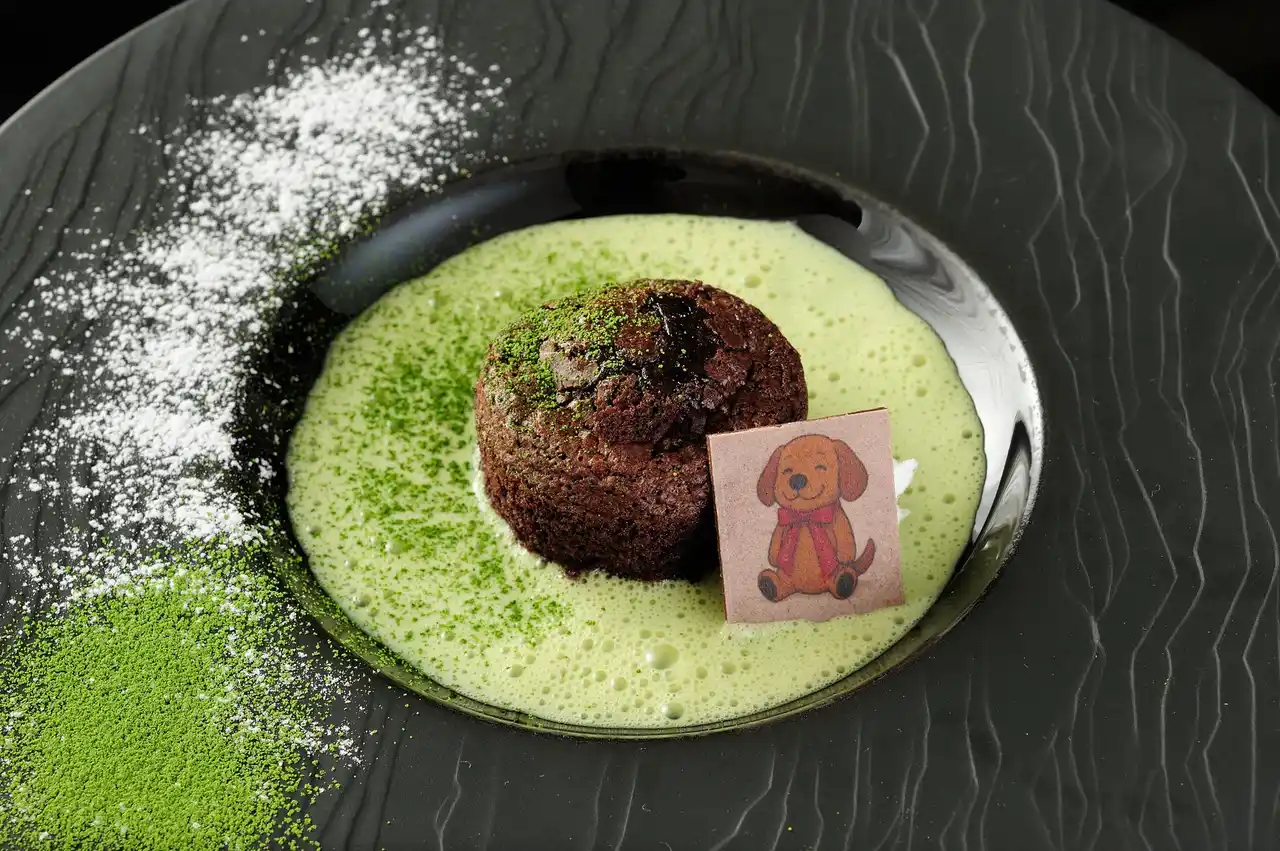 ナイフを入れると、しっとりとした生地からふわりとカカオの香りが広がる温かいガトーショコラ。濃厚でありながら、抹茶のほろ苦さと柑橘の爽やかな酸味が絶妙なバランスを生み出し、最後のひと口まで重たさを感じさせません。添えられたチョコレートには、ホテルグランヴィア岡山のマスコット“晴太 -HARETA-”が描かれており、思わず写真に収めたくなる可愛らしさも魅力。 |