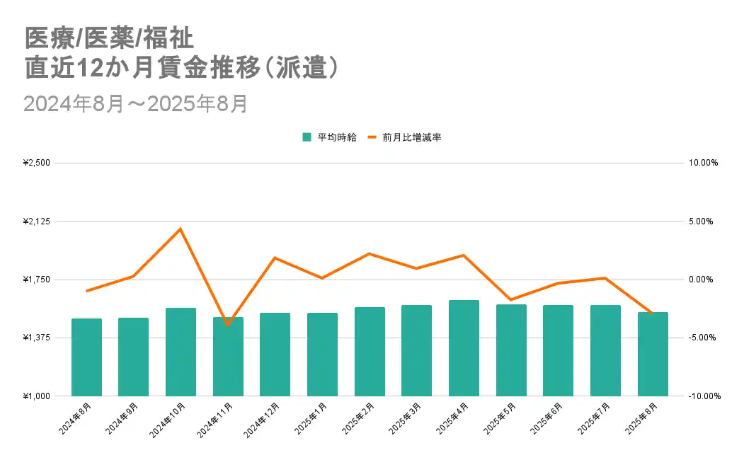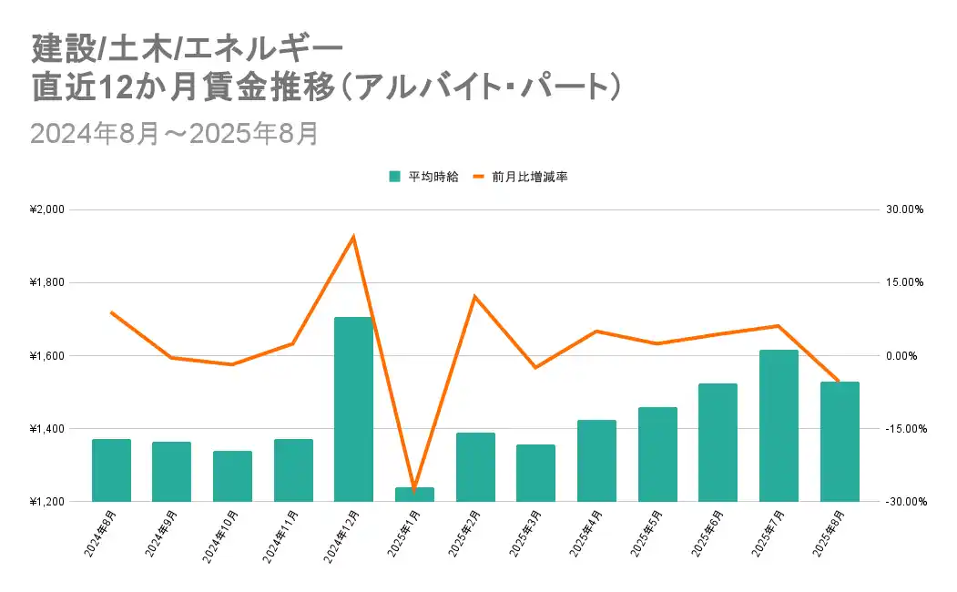 「建設/土木/エネルギー」では、株式会社ケイ・マックスが時給2,333円の求人を2024年12月と2025年7月に大量出稿。特に2024年12月には600件を超える出稿があり、これにより平均時給が大きく上昇しました。出稿が減少した後は、平均時給も減少しています。2025年4月から2025年7月にかけては上昇傾向を見せていたものの、2025年8月にかけては減少に転じています。 |