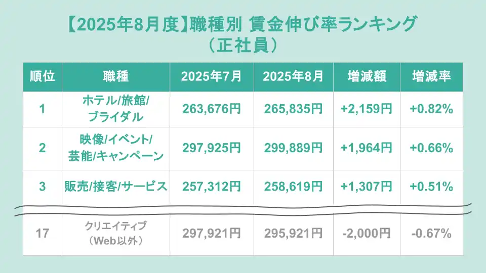 正社員の職種別賃金伸び率ランキング(前月比)トップ3は、1位が「ホテル/旅館/ブライダル」(増加額+2,159円、増加率+0.82%)、2位が「映像/イベント/芸能/キャンペーン」(増加額+1,964円、増加率+0.66%)、3位が「販売/接客/サービス」(増加額+1,307円、増加率+0.51%)でした。 |