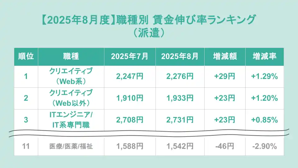派遣の職種別賃金伸び率ランキング(前月比)トップ3は、1位が「クリエイティブ(Web系)」(増加額+29円、増加率+1.29%)、2位が「クリエイティブ(Web以外)」(増加額+23円、増加率+1.20%)、3位が「ITエンジニア/IT系専門職」(増加額+23円、増加率+0.85%)でした。 |