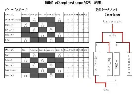 決勝はなかなか決着がつかずPK戦へ。白熱のPK戦を制し、kenpoyo選手が優勝を飾りました。 準優勝は吉田とん、3位はおーんニキ、4位はJMP(いずれもプレイヤーネーム、敬称略)。 優勝者には特産品「いるまんじゅう」と大会特製「いるティーシャーレ(盾)」を贈呈しました。 |