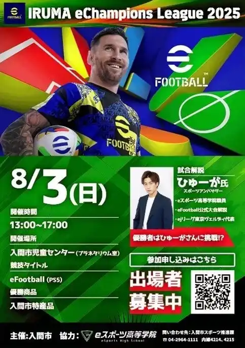 入間市スポーツ振興まちづくり条例に則り、「スポーツがつくる活気あふれるまち」を目指す入間市は、2025年8月3日、同市児童センターのプラネタリウム室で、市主催としては初となるeスポーツ大会「IRUMA eChampions League 2025(競技タイトル:eFootball)」を開催しました。進行・解説は入間市スポーツアンバサダーのひゅーが氏(eFootball世界大会での公式解説実績) が務め、市内外から10名が参加しました。会場には子どもたちを中心に観戦者が集まり、地域の新たなスポーツ体験として関心を集めました。 |