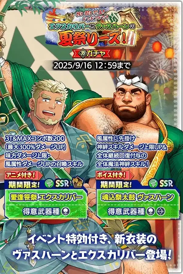 さらに、SSR魂友「魂込祭太鼓 ヴァスハーン」とSSR神器「愛逢笹祭 エクスカリバー」が入手可能な期間限定の「想い願い打上! ドンドコドン!エクスカリバーとヴァスハーンの夏祭りーズ!」ガチャも登場! |