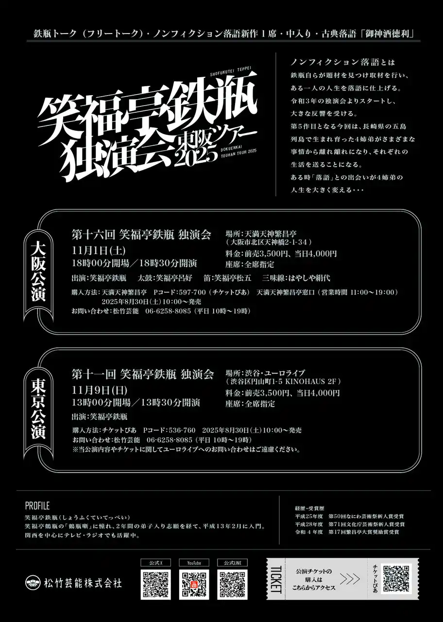 ◆笑福亭鉄瓶独演会 東阪ツアー 各公演詳細 |