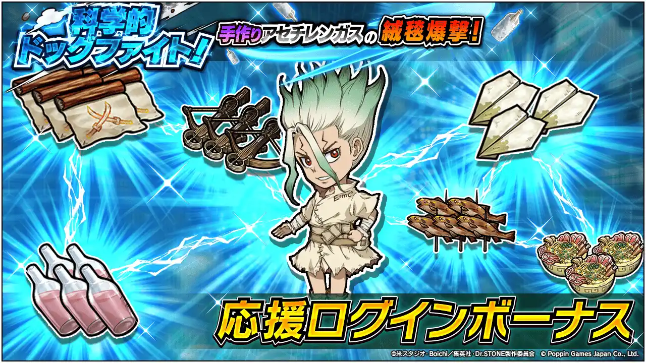 ポッピンゲームズジャパン株式会社は、AppStore/GooglePlayで配信中の『Dr.STONE バトルクラフト』にて新イベント&新ガチャを開催したことをお知らせいたします。 |
