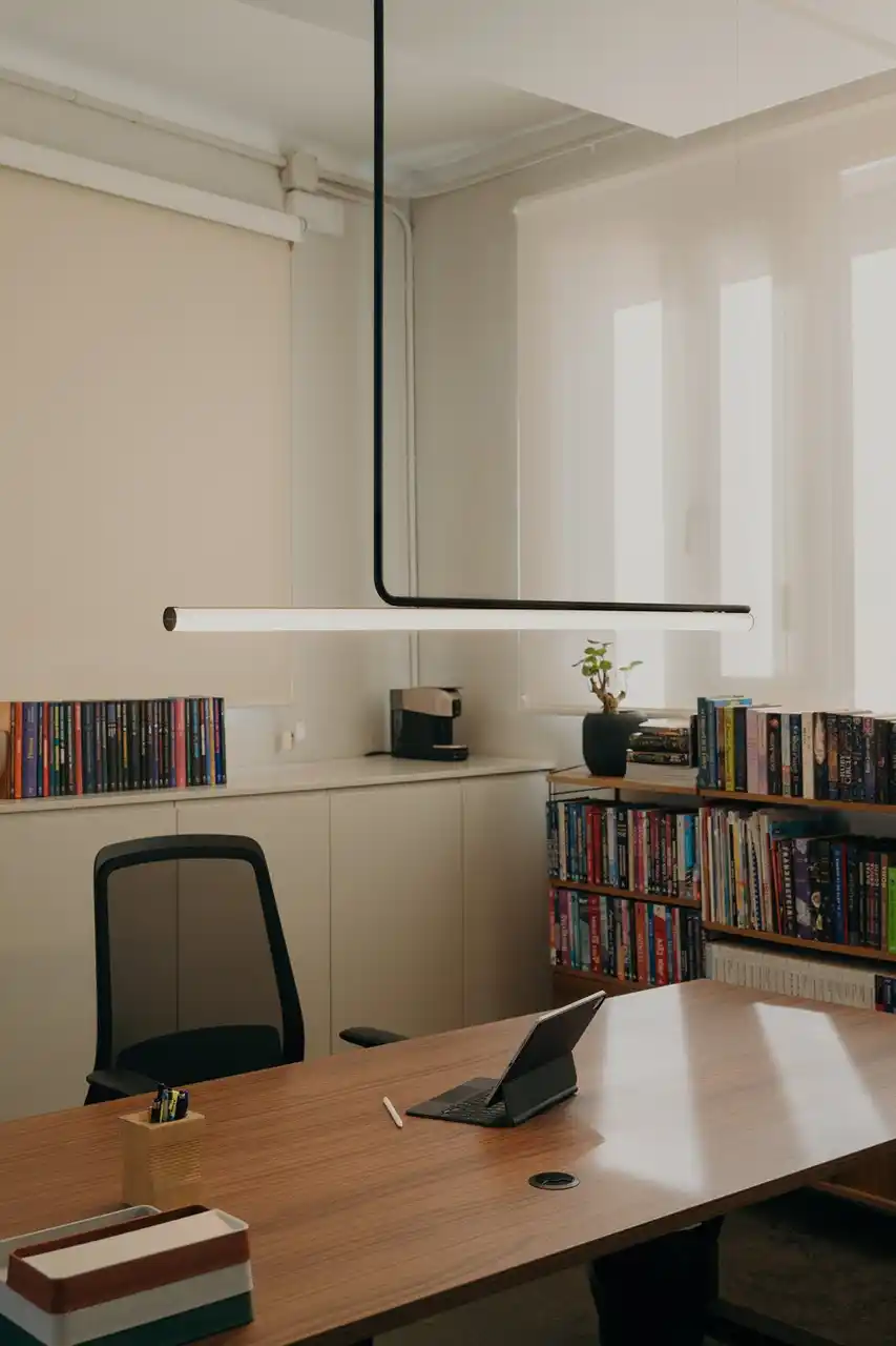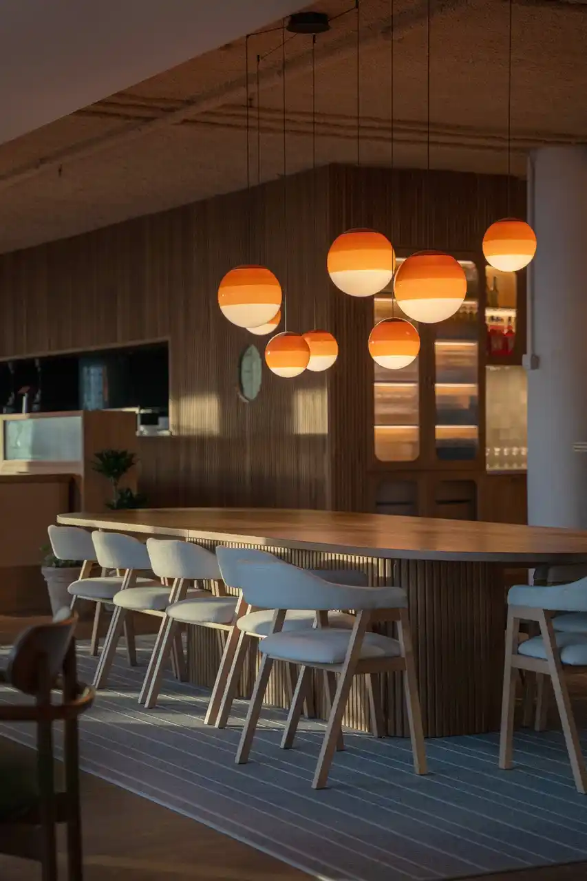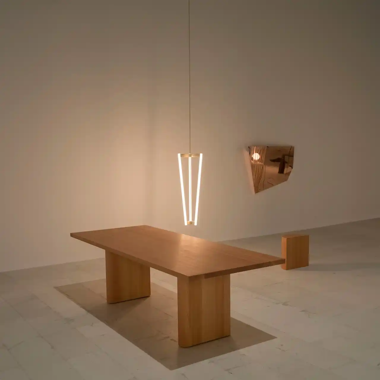 アンブロシアは、L字型のポールとバータイプのLED照明というミニマルな要素で構成されたペンダント照明。長尺のテーブルやカウンターで使用できる最大3mのサイズがすっきりと統一した直線でアインと空間全体への十分な明るさを両立させます。ポール部は、内部ワイヤー吊りで、自由に振れる構造です。シンプルさや機能性、拡張性を備えたことで2023年iF DESIGN AWARDを受賞しました。 |