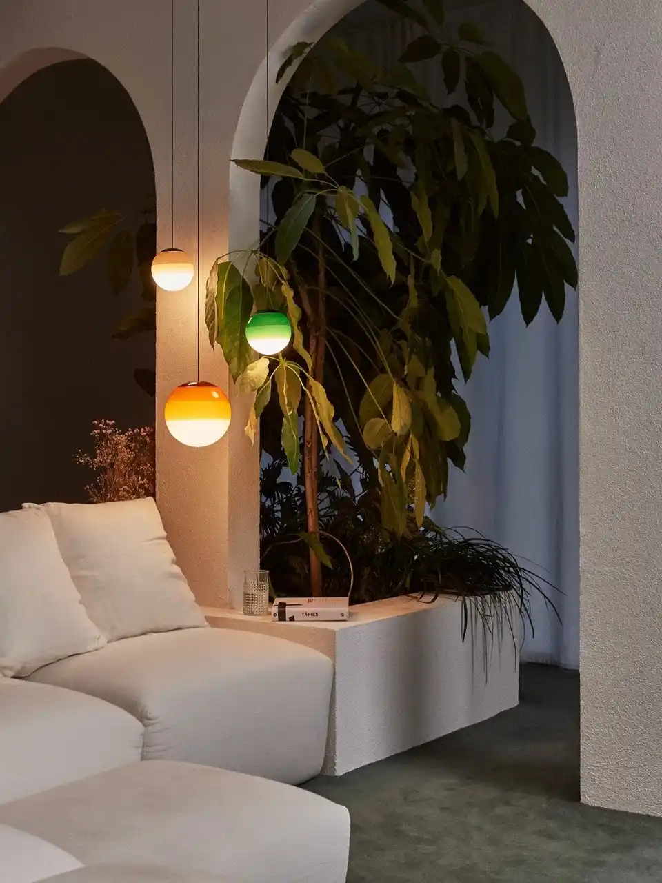 ディッピング・ライトは、光と色彩の調和を楽しめるアートピースのようなシリーズです。光が塗装の層を透過することで、独特のグラデーションが生まれ、幻想的な雰囲気を演出。消灯時はカラフルなガラスオブジェとして空間のアクセントとなります。 |