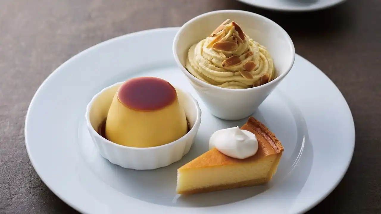 焼き芋クリームで仕立てたミニパフェ、カスタードプリン(ミニ)、デンマーククリームチーズケーキをワンプレートに盛り合わせました。 |