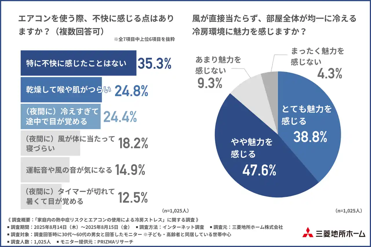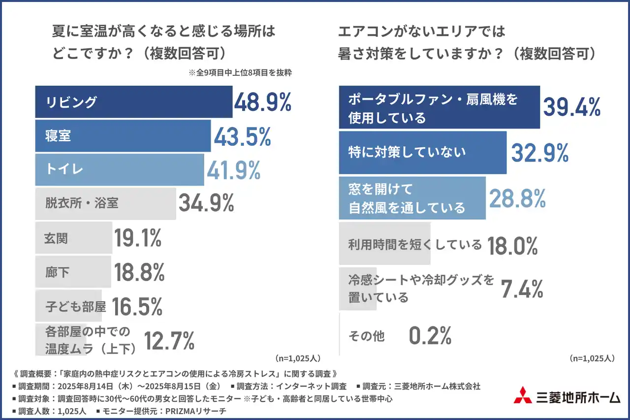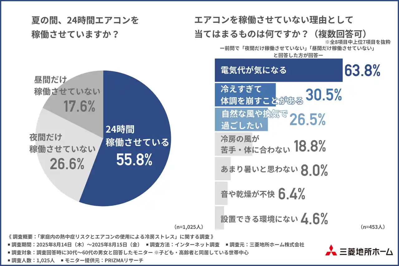 三菱地所ホーム株式会社(所在地:東京都新宿区、代表取締役社長:細谷 惣一郎)は、30代~60代の男女(※子ども・高齢者と同居している世帯中心)を対象に「家庭内の熱中症リスクとエアコンの使用による冷房ストレス」に関する調査を行いました。 |
