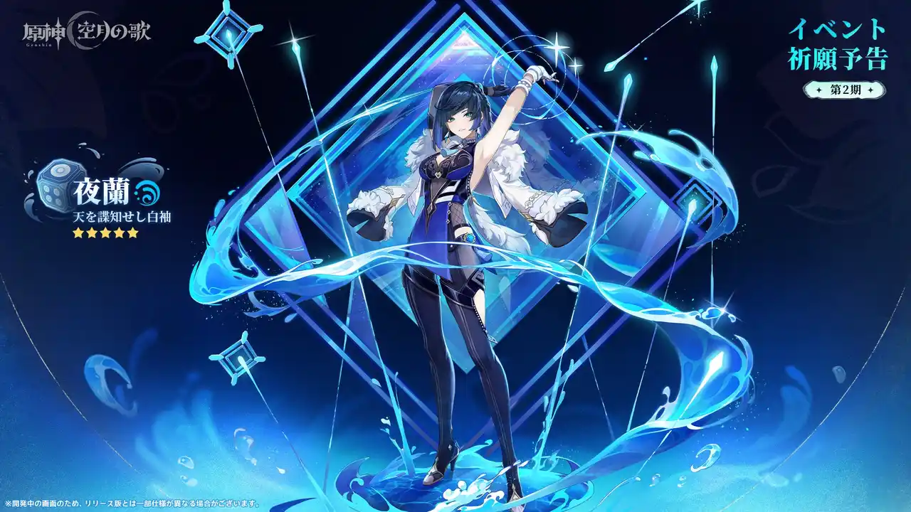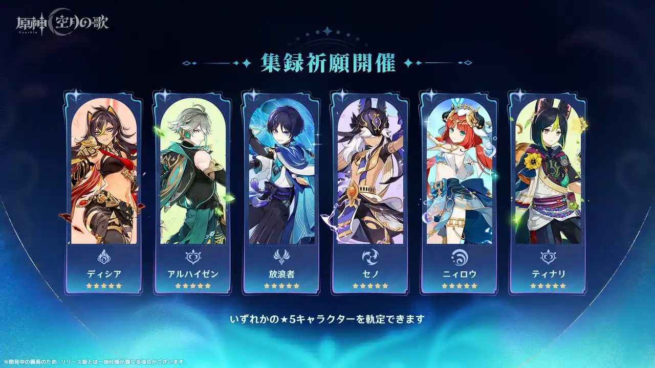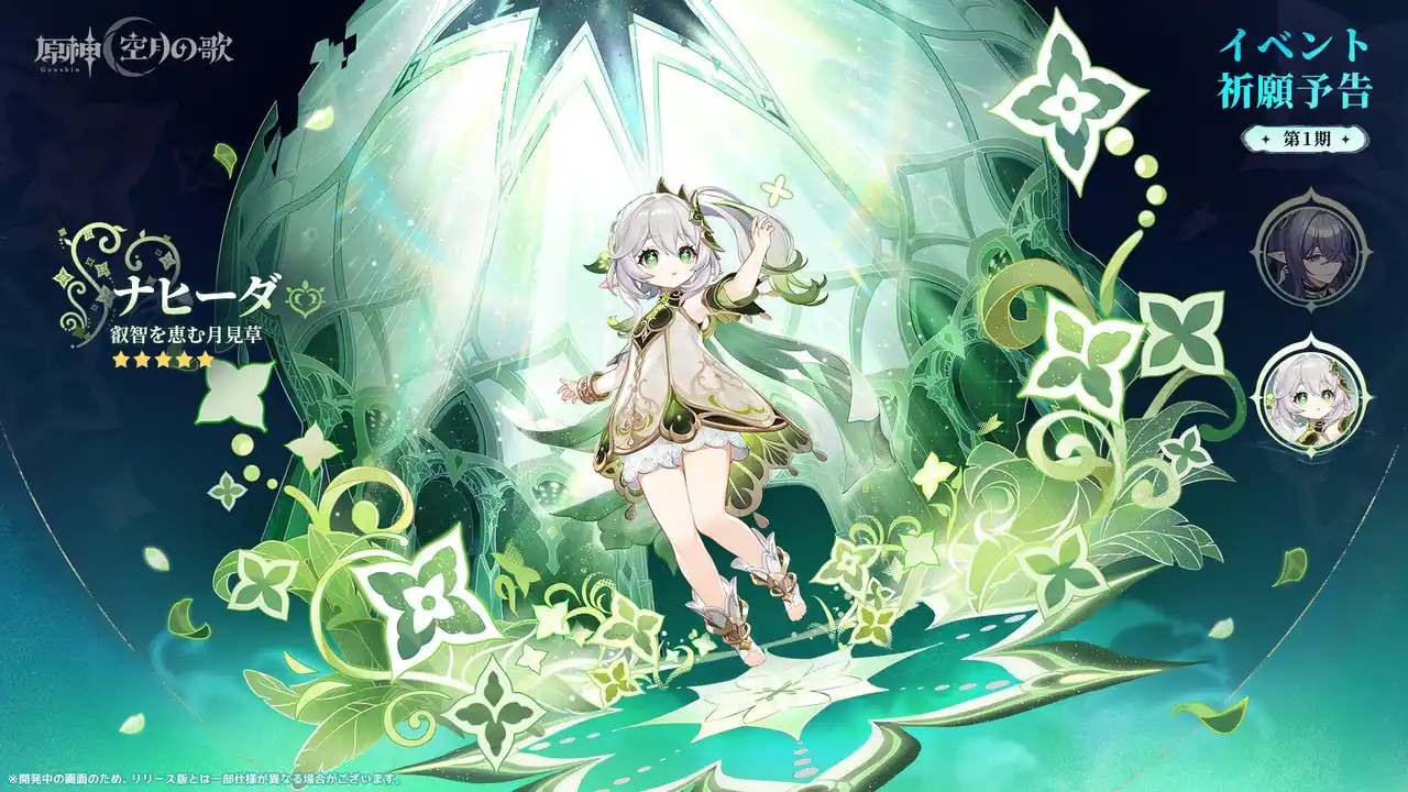 「Luna I」前半のイベント祈願では、「ラウマ」が新たに登場し、「ナヒーダ」が復刻登場します。さらにスメールがテーマの集録祈願も同時開催します。後半では、「フリンズ」と「アイノ」が新たに登場し、「夜蘭」が復刻登場します。 |
