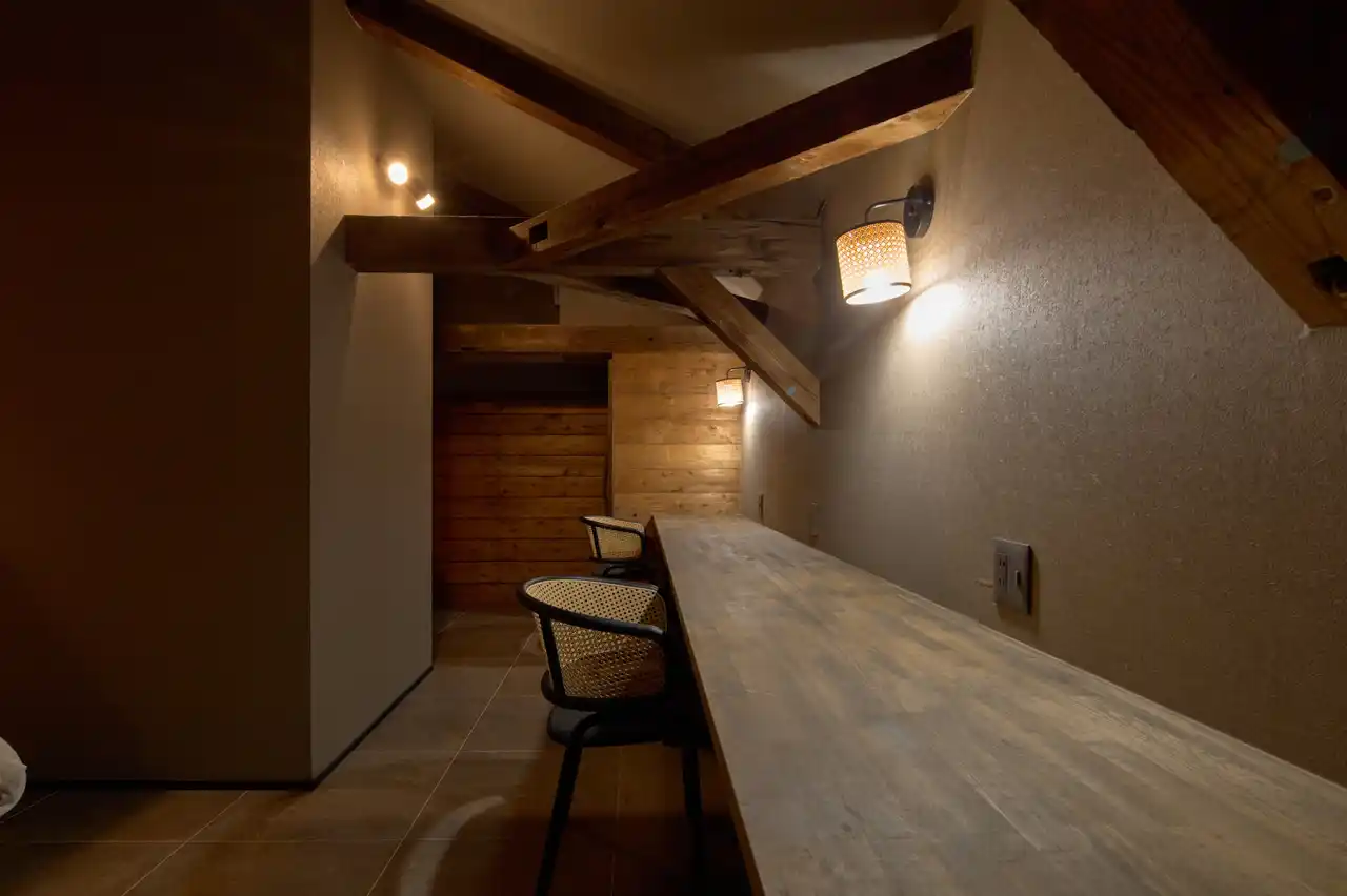 | 宿の2階は、伝統的な小屋組を活かした開放感あふれる空間。 | ||||||||||||||||||||||||||||
