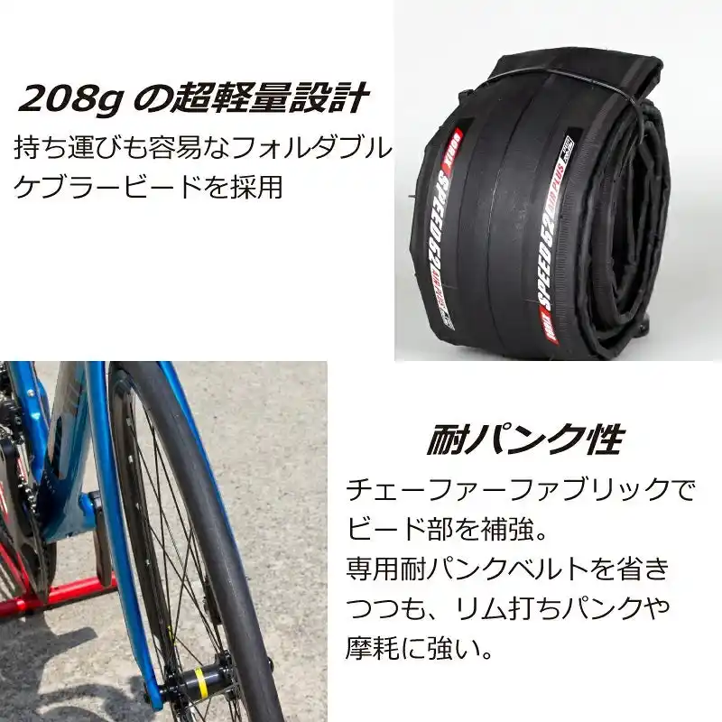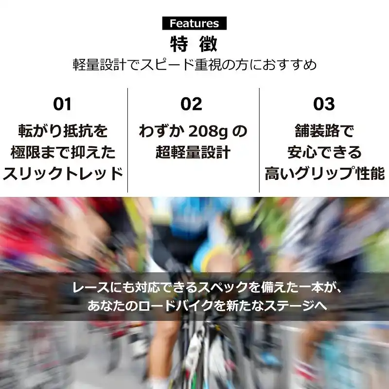 わずか208gの軽量設計、120TPIの高密度ケーシング、そしてスリックトレッドを組み合わせることで、転がり抵抗の少なさ・高いグリップ力・圧倒的な軽さを兼ね備えています。 |