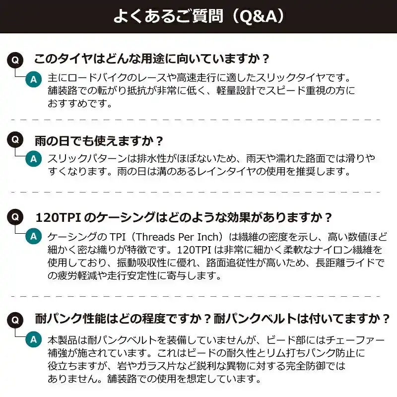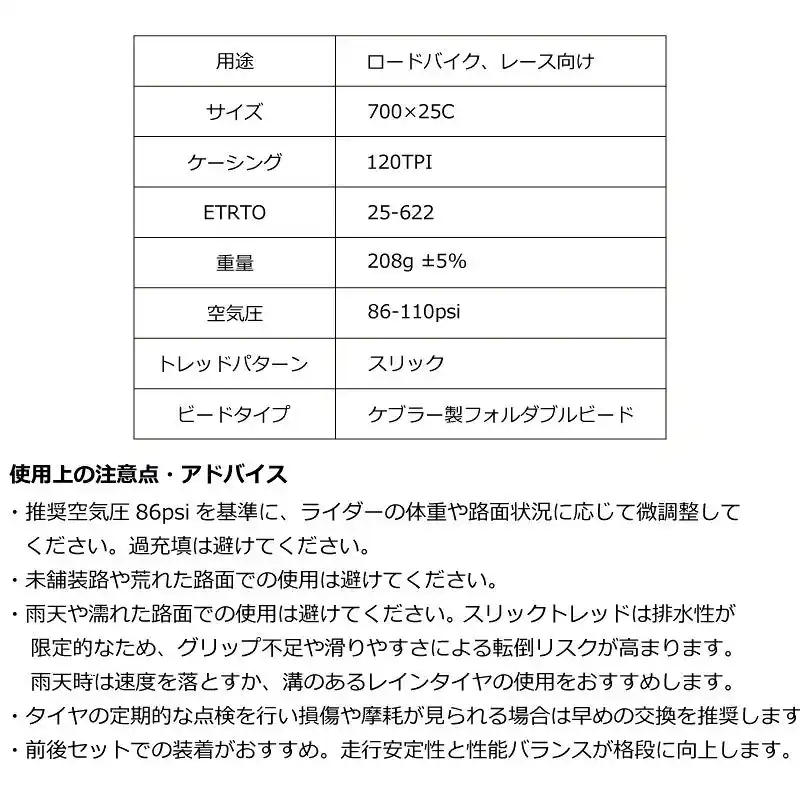 ・推奨空気圧86psiを基準に、ライダーの体重や路面状況に応じて微調整して ください。過充填は避けてください。 ・未舗装路や荒れた路面での使用は避けてください。 ・雨天や濡れた路面での使用は避けてください。 スリックトレッドは排水性が 限定的なため、グリップ不足や滑りやすさによる転倒リスクが高まります。 雨天時は速度を落とすか、溝のあるレインタイヤの使用をおすすめします。 ・タイヤの定期的な点検を行い損傷や摩耗が見られる場合は早めの交換を推奨します ・前後セットでの装着がおすすめ。走行安定性と性能バランスが格段に向上します。 ・タイヤは1本売りです。 |