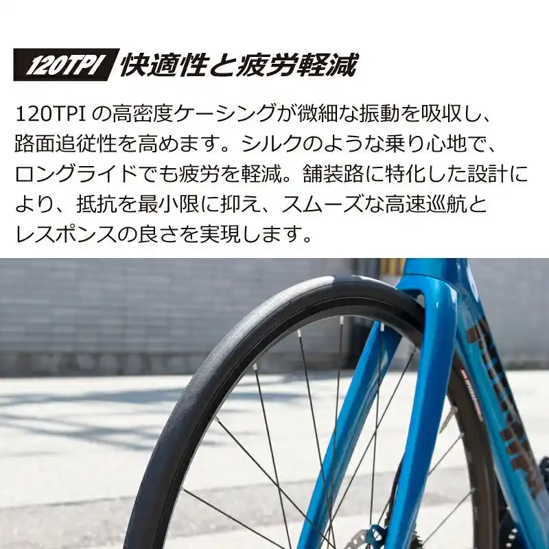 【快適性と疲労軽減】 120TPIの高密度ケーシングが微細な振動を吸収し、路面追従性を高めます。 |
