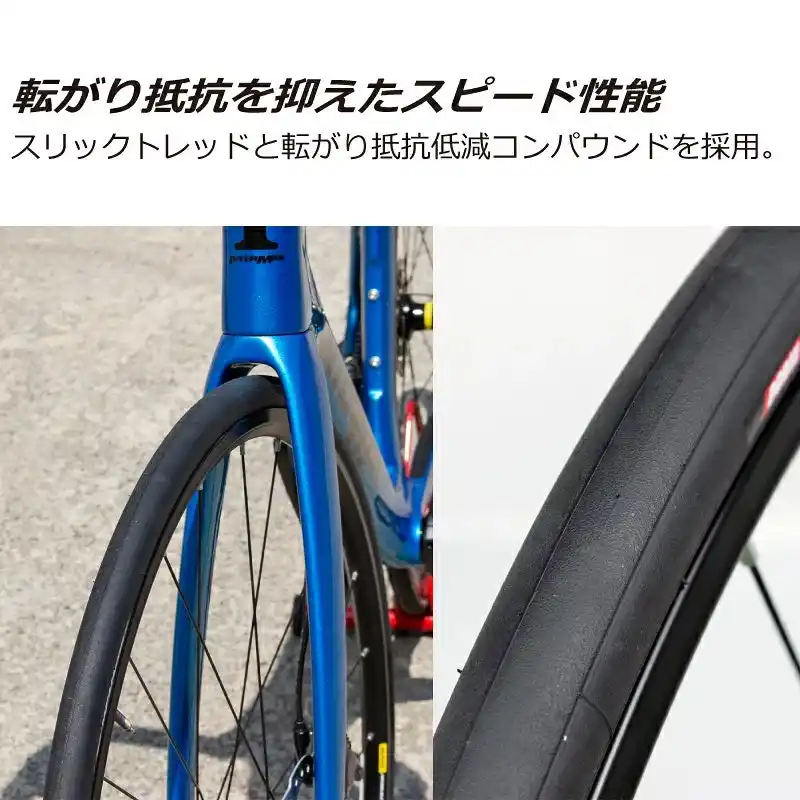 【転がり抵抗を抑えたスピード性能】 スリックトレッドと転がり抵抗低減コンパウンドを採用しています。 |