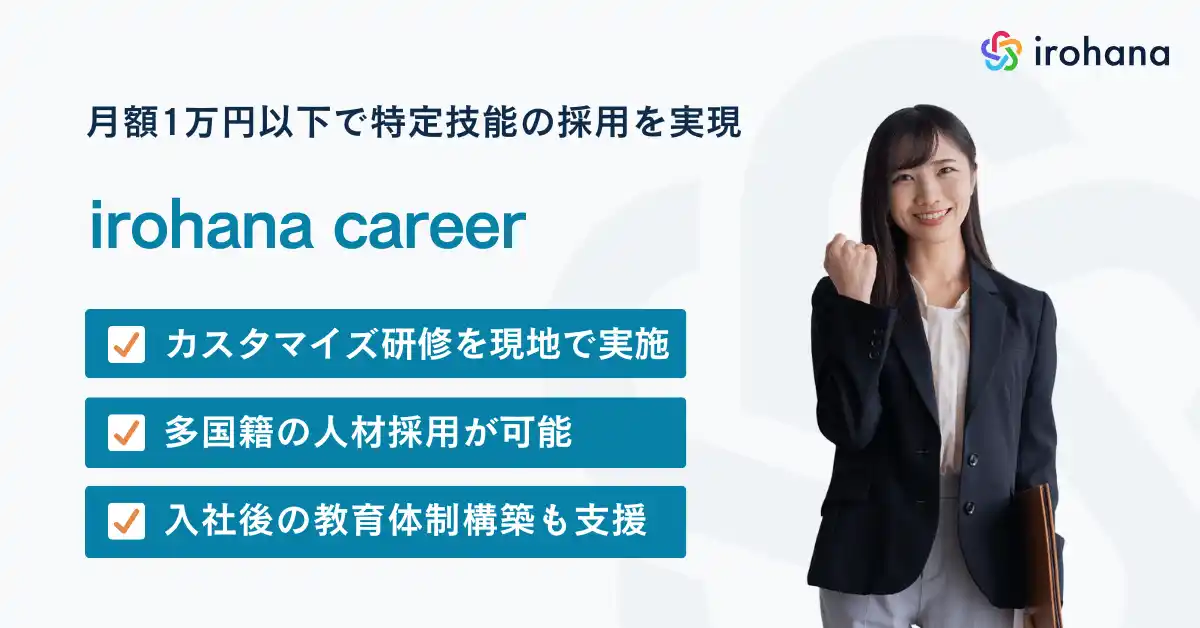 特定技能外国人に特化した人材紹介サービスです。受け入れ企業より事前にお伺いした採用条件や人物要件に基づき、いろはなが事前面談を行い、厳選した候補者を推薦し面接を設定します。精度の高いマッチングだけでなく、採用後のビザ申請から入社手続きまで、採用活動にかかる全ての工程を包括的にサポートいたします。 |