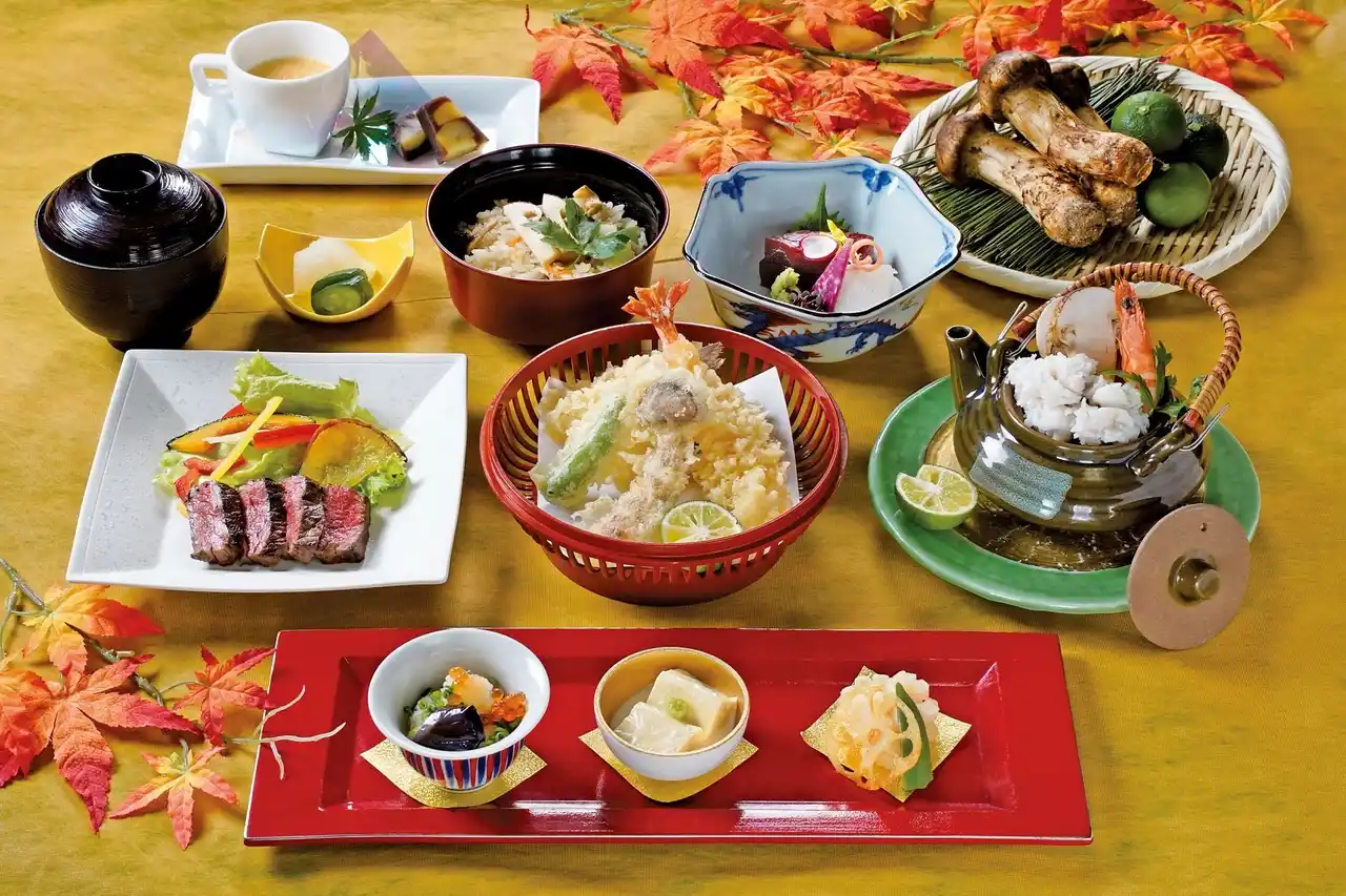 旬の味覚「松茸」の土瓶蒸し、天麩羅、松茸五目御飯と共に、羽衣自慢の「天麩羅」「鉄板焼」もご一緒にお愉しみいただけます。 |