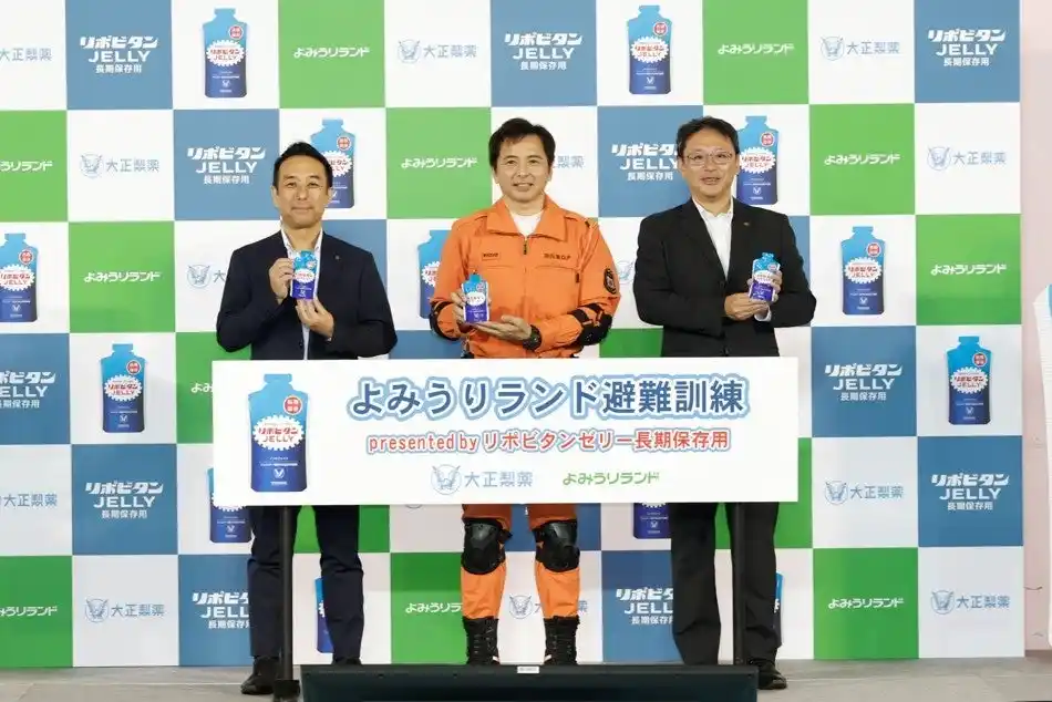 今回の取り組みは、2021年より大正製薬がよみうりランドの「グッジョバ!!」にパートナー企業として参画し、これまで継続的な協力関係が構築されてきたことを背景に、異業種である両社が共同で実施。大正製薬は「災害時に大人からお子さままで、栄養と元気を届けられる防災用備蓄食をつくりたい」という思いのもと「リポビタンゼリー長期保存用」<清涼飲料水(ゼリー飲料)>を開発し、防災備蓄の提案を続けています。また、よみうりランドは、1964年の開園以来60年以上、お客様の安全・安心を第一に考え、避難訓練を重ねてきました。また、2011年の東日本大震災をきっかけに、さらに訓練の精度を高め、安心して楽しめる環境づくりを推進していきます。 |