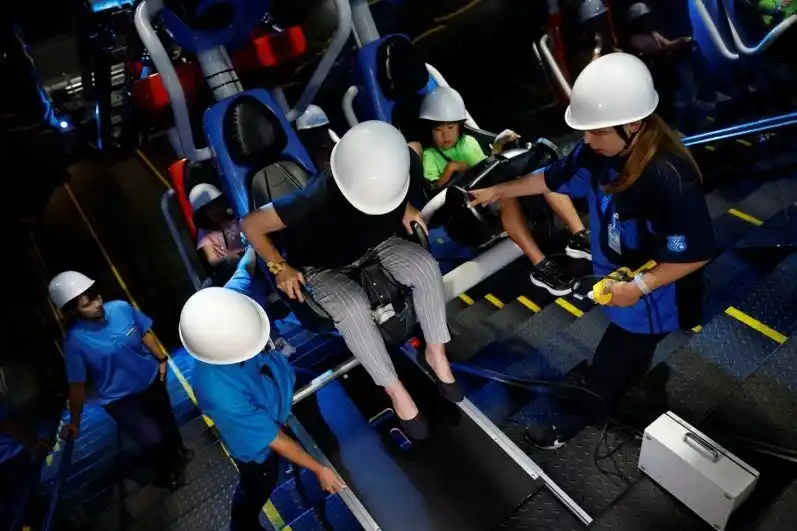 当日の第一部は、よみうりランドのグッジョバ!!「SPACE factory」内のアトラクション「リポビタンロケット☆ルナ」において、震度6弱の首都直下地震を想定した避難訓練が行われました。約120名の来園者が順番にアトラクションを体験する中、地震発生を知らせるアナウンスとともにアトラクションが緊急停止。乗客に対してスタッフが迅速に救助活動を行い、そのほか待機列や屋外にいた参加者はスタッフの誘導に従い指定の避難スペースへ移動し、約120名が一堂に避難しました。乗客救出から園内での大規模な避難誘導まで、一連のプロセスが実際の運用に従って実践的に実施されたことで、“遊園地”という非日常の場だからこそ得られるリアルな緊張感と気づきを体験する訓練となりました。 |