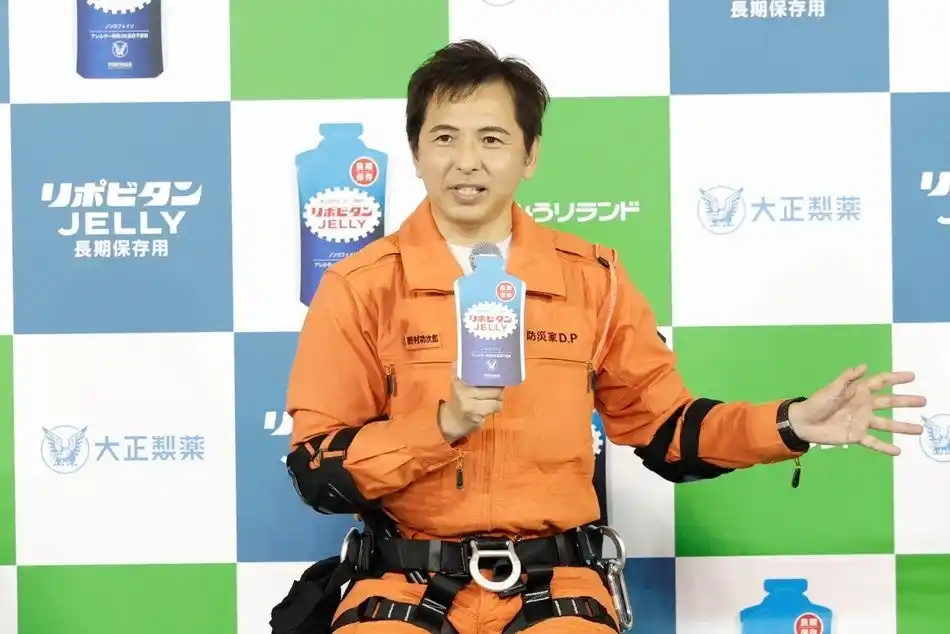 <清涼飲料水(ゼリー飲料)>については、「大正製薬らしい防災用備蓄食とは何かを考え、老若男女問わず栄養と元気を届けたいという思いから、誰でも食べやすいゼリータイプを開発しました」と紹介。さらに「リポビタンゼリー長期保存用はコンパクトで持ち運びができる珍しい防災用備蓄食です。出先でもしもの際に心と身体の支えとなるよう、持ち出し用として活用してほしい。」とコメントしました。野村さんが試飲すると、「慣れ親しんだ味で非常に食べやすく、避難所で疲労した身体にも取り入れやすいですね」と感想を述べ、備蓄のポイントに絡めて食べやすさや利便性を語りました。 |
