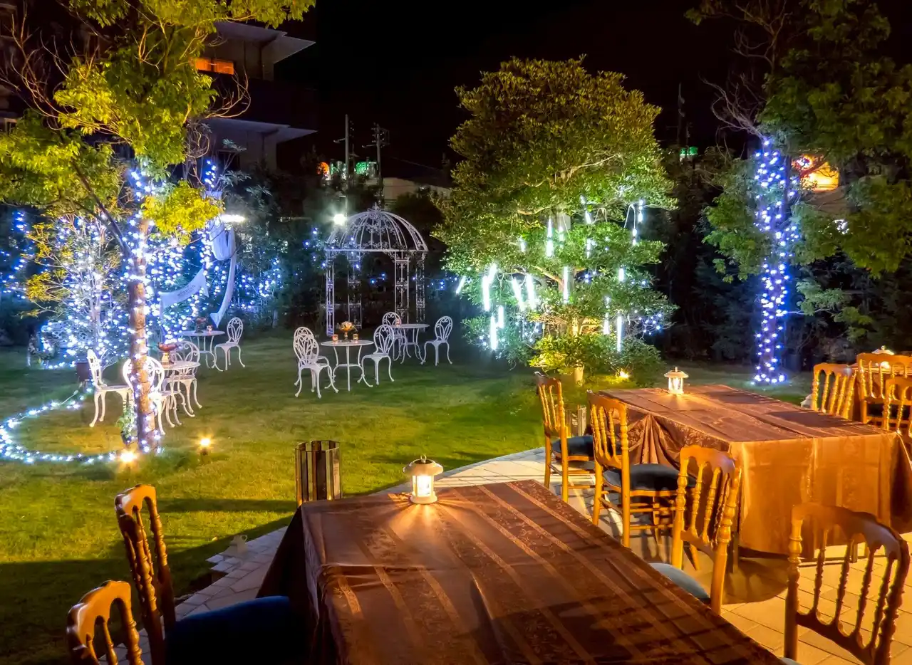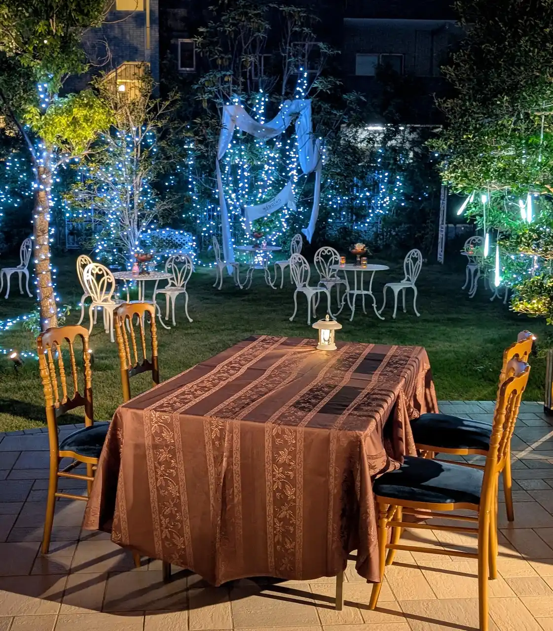 星降る庭には5卓のガーデン席。イルミネーションを眺め夜風に当たりながらグラスを傾けるひととき。 |