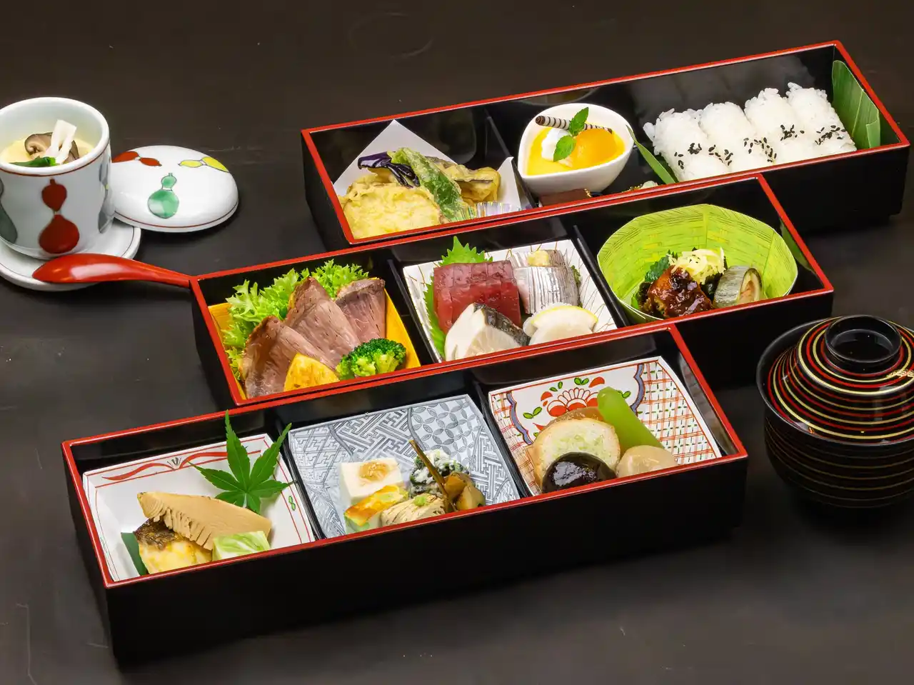 「旅館仕込みのお料理をお弁当に」をテーマにした『結箱』と同様のクオリティを、法事の席でのおもてなしお弁当としてアレンジいたしました。お宿でお出ししている季節の素材を活かした創作会席料理をベースとしたお弁当は4種類。容器は使い捨て型・回収型の両方を採用。弊社スタッフが責任を持ってご指定の場所にお届けいたします。 |