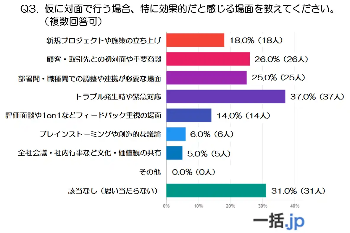最も多かったのは「トラブル発生時や緊急対応」で37.0%(37人)を占め、予期せぬ事態においては迅速かつ確実な意思疎通が求められるため、対面でのやり取りが重要視されていることが分かります。 |