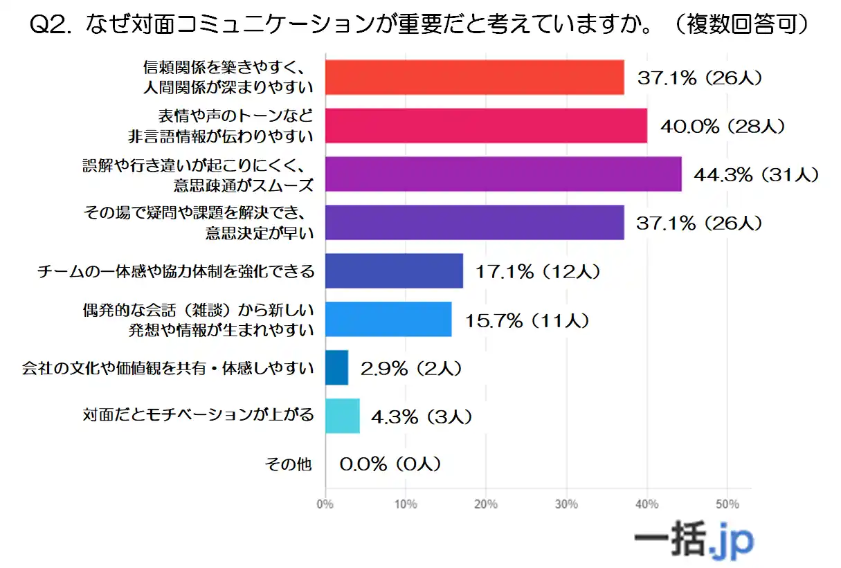 最も多かったのは「誤解や行き違いが起こりにくく、意思疎通がスムーズ」で44.3%(31人)を占め、対面コミュニケーションの最大の価値は認識の齟齬を防ぎ、確実な情報伝達を可能にする点にあることが分かります。やはり正確さを求める場面では、オンラインよりも対面の方が安心感が強いといえるでしょう。 |