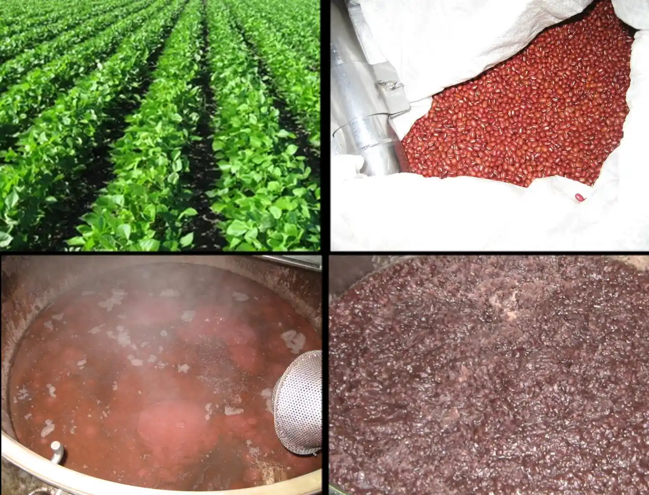 左上:契約農場の小豆畑 右上:小豆の選別 左下:小豆の炊いている様子 右下:小豆の炊き上がり |