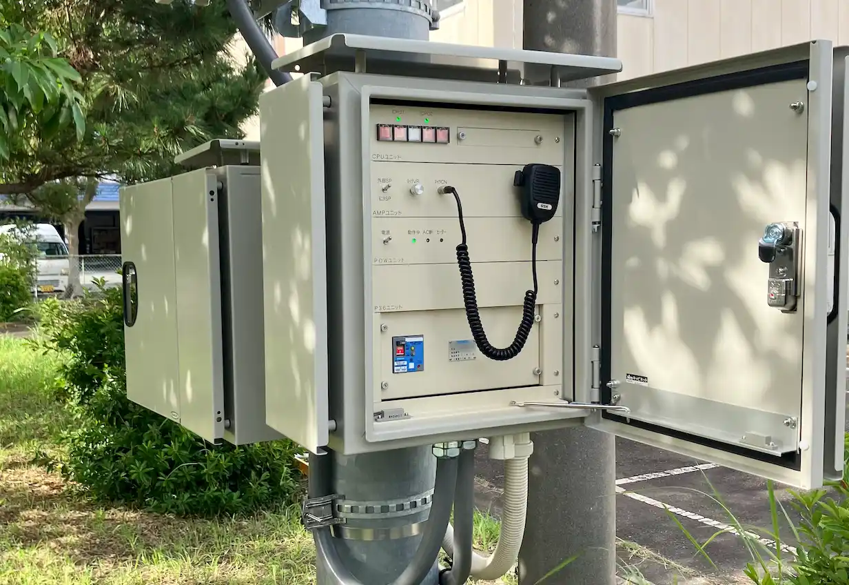 屋外放送装置制御部写真:光回線、携帯電話網、衛星インターネット回線で通信します。 |