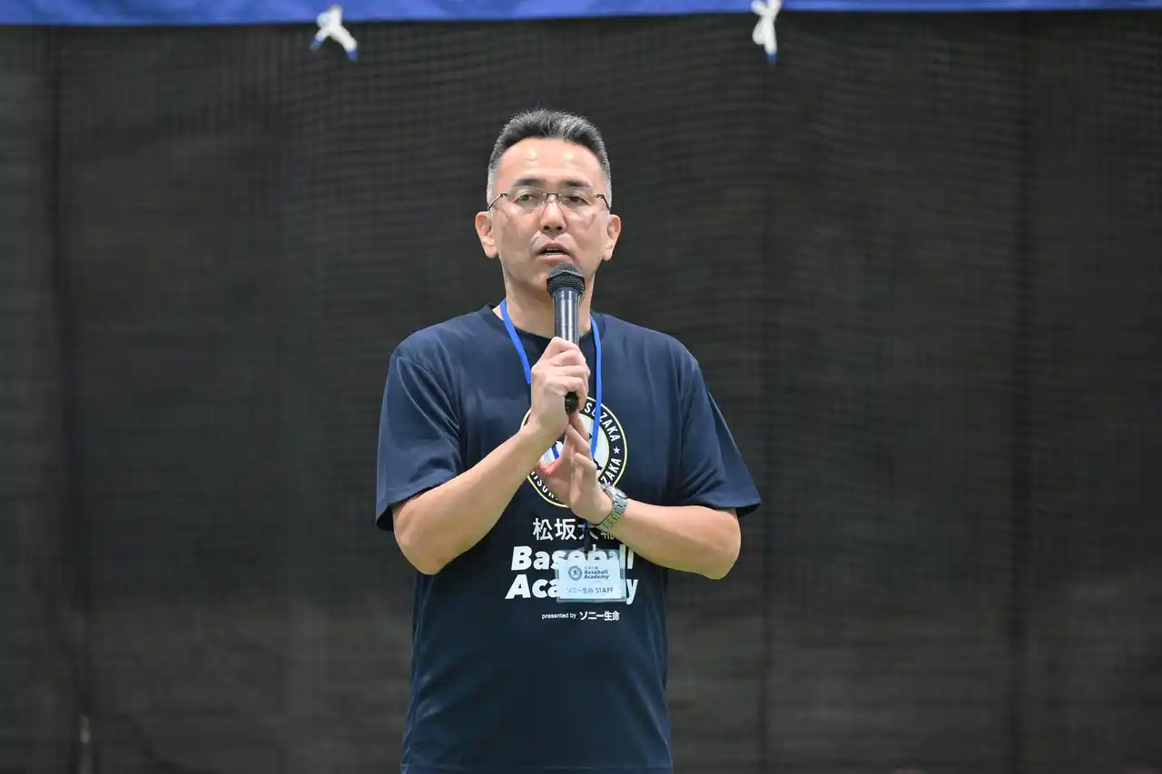 教室の最後には、ソニー生命保険株式会社札幌ライフプランナーセンター第1支社 支社長 西野圭より締めの挨拶を行いました。「今日は松坂選手から本当にいろんなことを学べたと思います。野球は優勝することだけが全てではありません。プロセスの中で得られる成長や経験が、みなさんを強くしてくれるはずです。保護者の方々にとっては、子どもたち一人ひとりが生きがいだと思いますので、ぜひ夢に向かって全力で頑張ってください。きっと次の“怪物選手”も今日の教室から生まれると信じています。」とコメントしました。 |