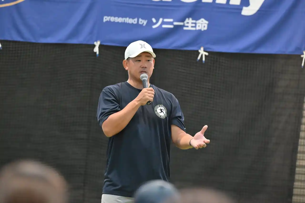 クロージングでは、未来ある子どもたちに松坂さんより激励が送られました。「練習はただやるだけ、やらされるだけでは自分のためになりません。自分が目指す姿をイメージしながら取り組んでください。これから中学・高校と進む中で、『意味がない練習だな』と思うものもあるかもしれませんが、そこで終わらせず、自分なりに意味を見出して取り組んでみてほしいと思います。 |