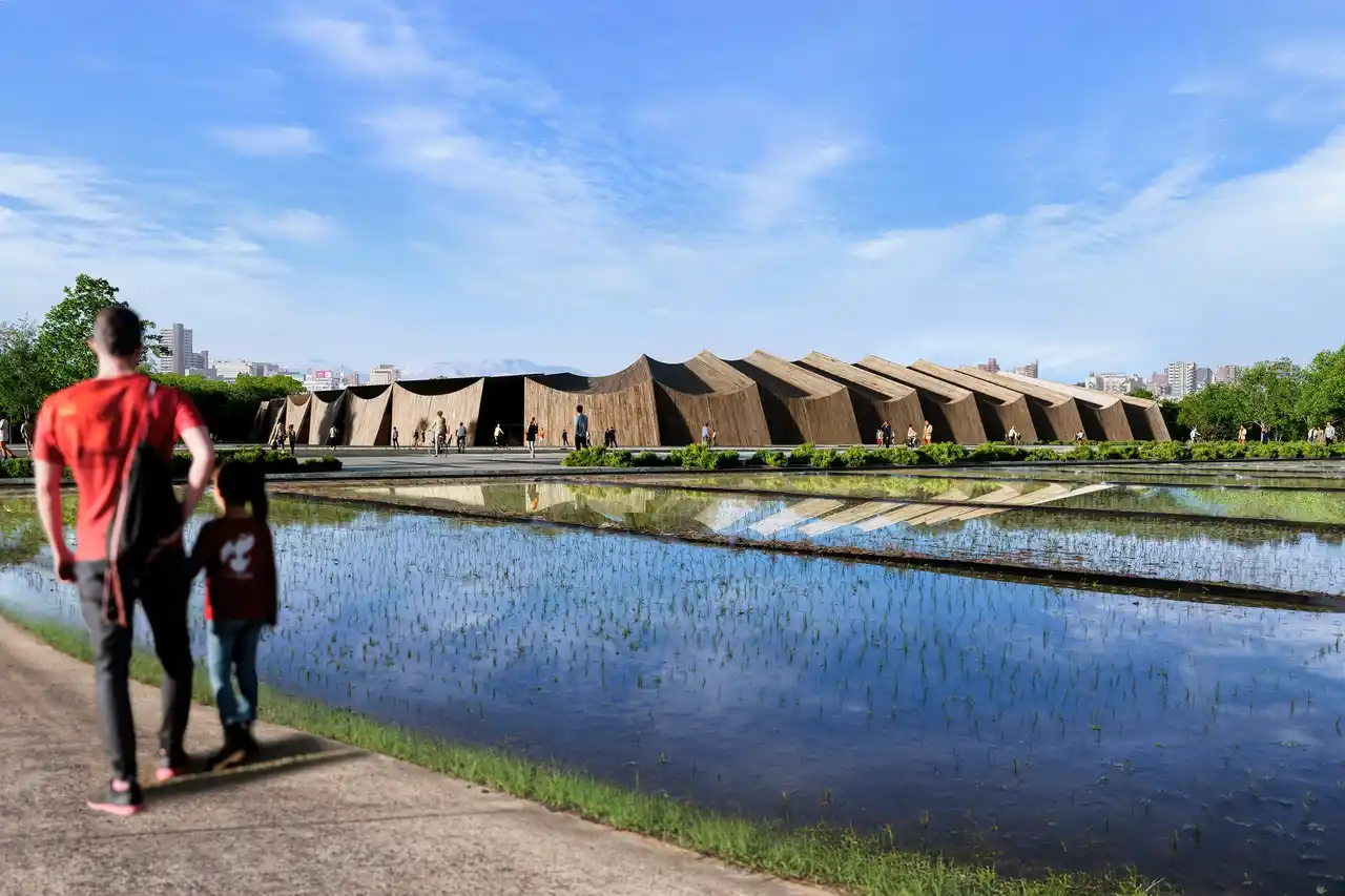 また、建設方法にも特徴を持たせています。構成部材を地域参加者が運び、引き起こすことでシェルや懸垂屋根を組み上げる方式を計画。祭礼における神輿や巨木建てに倣った祝祭的な建設プロセスとすることで、単なる工事を超えた「復興的建設の象徴」として位置づけています。 |