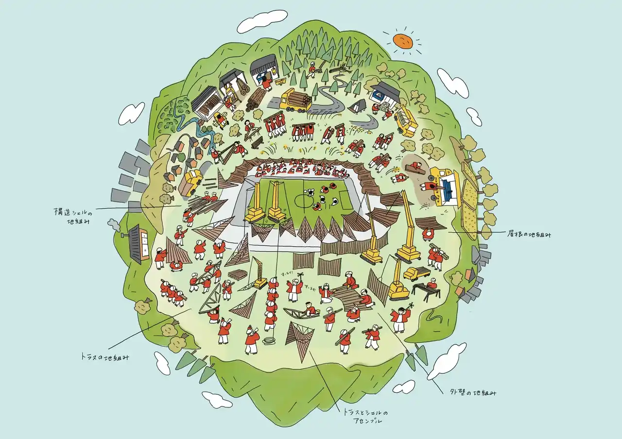 日本発のサステナブル建築を模索するにあたり、日本の伝統である「式年遷宮」から着想を得ています。そこでは、資源循環・地域参加・技術伝承という「モノ・コト・ヒト」の3つの循環が実現されています。この理念を踏まえ、スタジアムの構造は木造を採用し、福島県産の製材を積層することで全体を形成します。 |