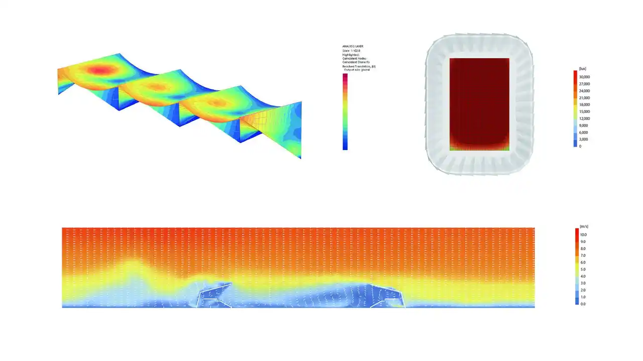 FEM解析で変形量を、年積算照度解析で芝生の生育環境を、CFD解析で風の効果を検証 |