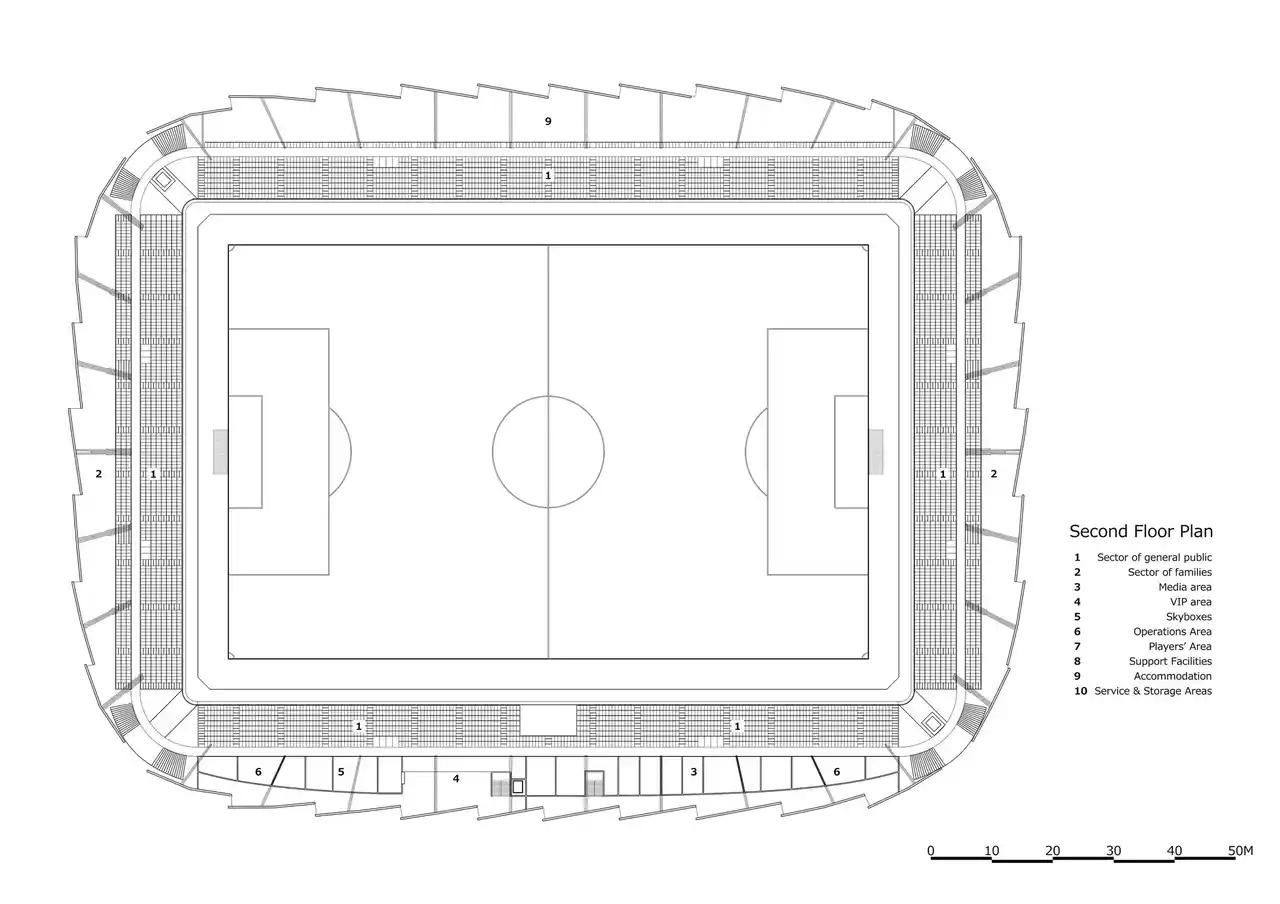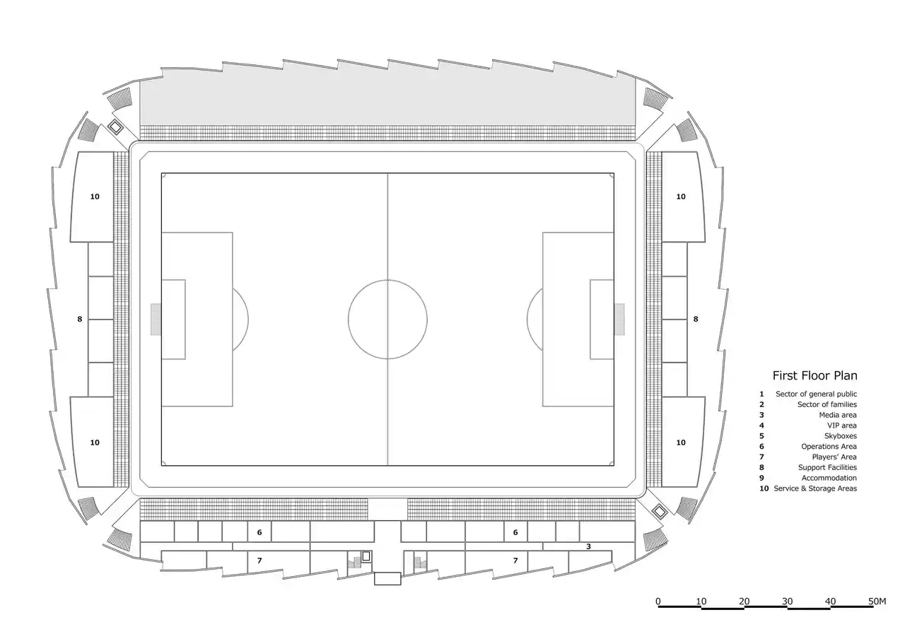 平面計画においては、建物を3000m2以下に分割し、断面は2階建・高さ16m以下に抑えることで準耐火建築物としました。4棟の境界部をエントランスとし、動線と分節を兼ねています。1階には更衣室や控室、トイレ、売店等を配置。メインスタンド側2階にはVIP席・実況席など主要機能を設け、バックスタンド側には収益性を考慮しホテル機能を導入しています。 |