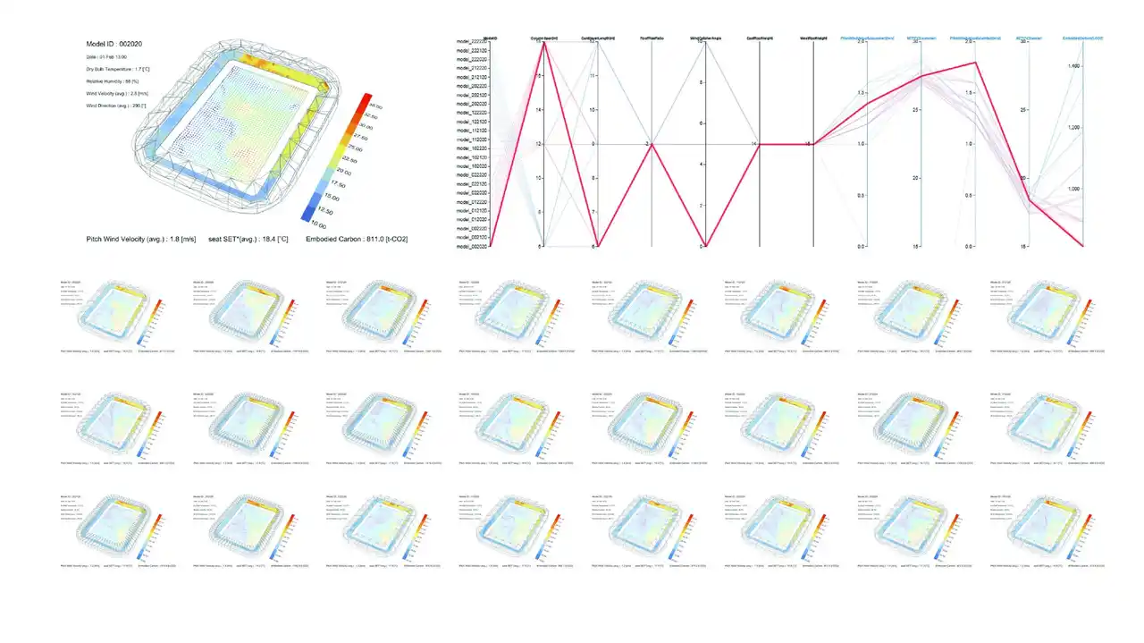 本計画では、建物の形状を数値化されたパラメーターとして扱い、スタジアムの観客席のSET*(気温、湿度、気流、放射、着衣量、代謝量から求まる温熱環境体感温度)、構造材の使用量によるカーボンニュートラルへの貢献、ピッチ面での風速や、芝生の育成に適した環境条件など、複数の要素を同時に検討するオプショニアリングを行います。これにより、建物の形や構造、環境性能の関係を定量的に把握し、スタジアム全体の空間の質や環境への配慮を最大限に高めることを目指します。構造合理性のみならず、環境への応答性や人とのつながり、地域資源との関係性を含んだ、持続可能な空間として構築していきます。 |