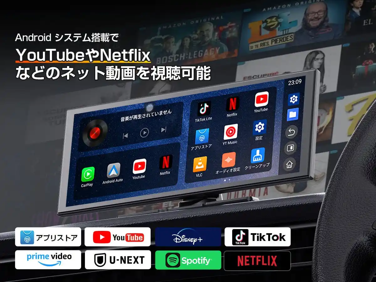 Androidシステムを内蔵し、YouTubeやNetflix、Prime Video、Disney+などのアプリを直接インストール可能。スマホを経由せずにストリーミング再生ができるので、通信の安定性も高く、車内が一瞬でエンタメ空間に変わります。自由度の高い使い方を叶える一台です。 |