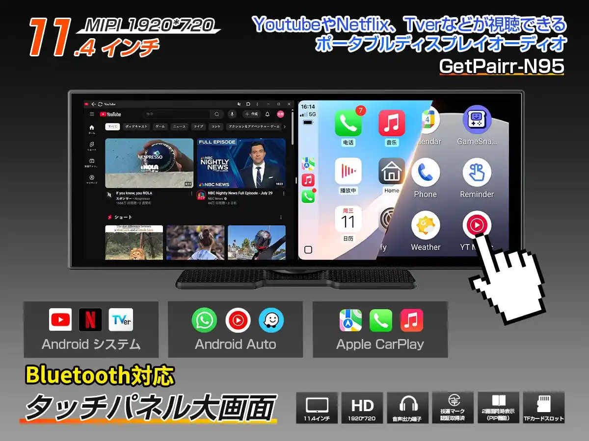 GETPAIRR(ゲットペアー) は、11.4インチ大画面ポータブルディスプレイオーディオ 「PND-N95」 を、Amazonスマイルセールの対象商品として特別価格でご提供します。 ケーブル不要でCarPlay/Android Autoを利用でき、YouTubeやNetflixなどの動画も車内で楽しめる本モデルが、期間限定で 31%オフ(23,580円 → 16,280円) に。 日常のドライブを、もっと快適で楽しい時間に変えるチャンスです! |