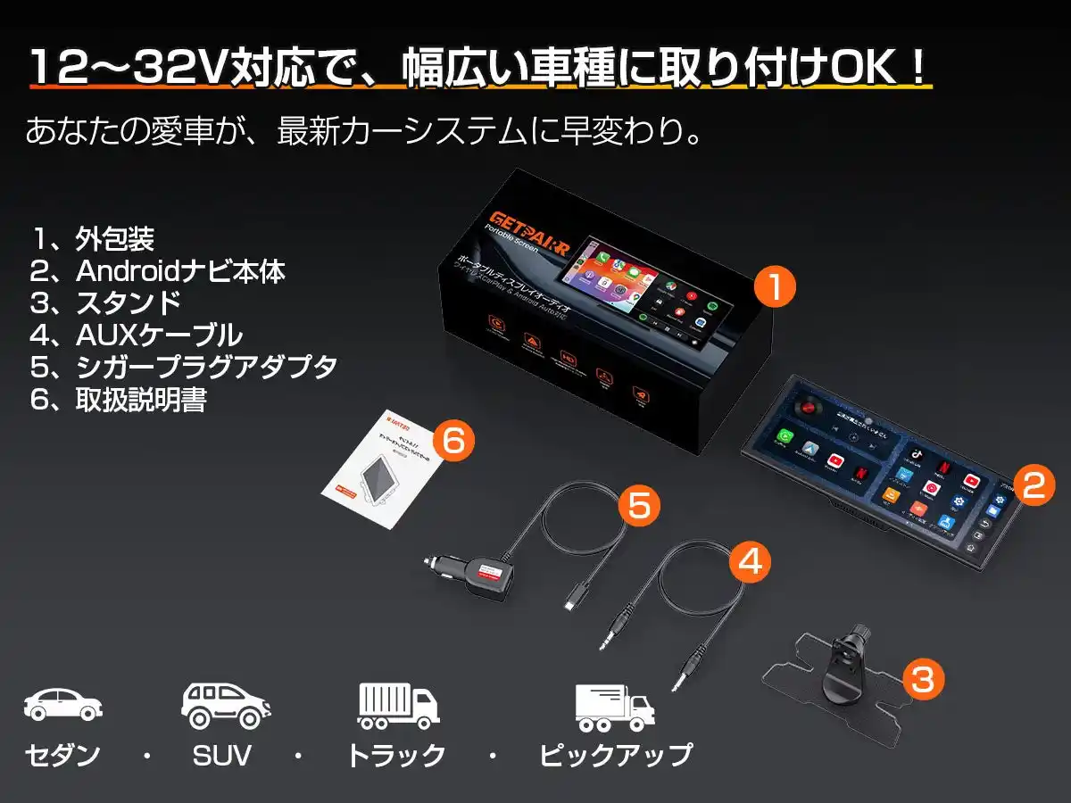 12~32V対応で、セダン・SUV・トラック・ピックアップまで幅広く設置可能。スタンドやケーブル類も同梱されており、購入後すぐに使用できます。 |