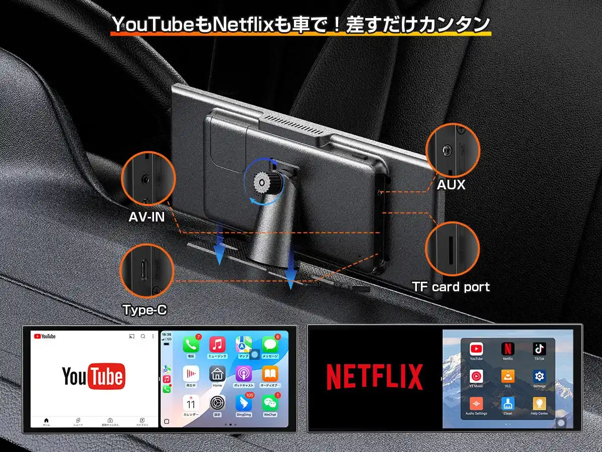 AV-IN、AUX、Type-C、TFカードスロットなど拡張性に優れ、バックカメラや外部ストレージとも簡単に連携できます。 |