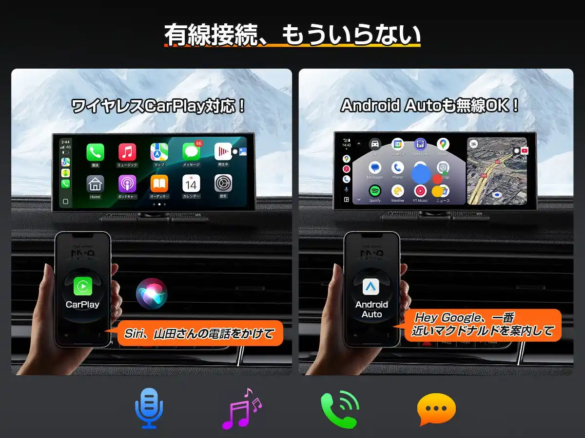 PND-N95はワイヤレスでCarPlayとAndroid Autoを利用でき、SiriやGoogleアシスタントを使って目的地検索や音楽操作もハンズフリーで可能です。 |