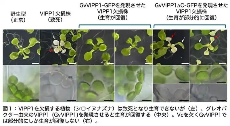| グレオバクターのVIPP1は、高等植物においてもチラコイド膜の形成を可能にすることが分かりましたが、このチラコイド膜形成能には、末端に付加された「Vc」と呼ばれる領域が不可欠であることが明らかになりました。また、VcはVIPP1に特徴的な配列と考えられていましたが、詳細な解析から、乾燥や高温といった極限環境に生息する古細菌などの祖先型のタンパク質にも付加されていること分かり、光合成に限らない膜保護機構として、進化的に獲得されてきたことが示されました。 | ||||||||||||