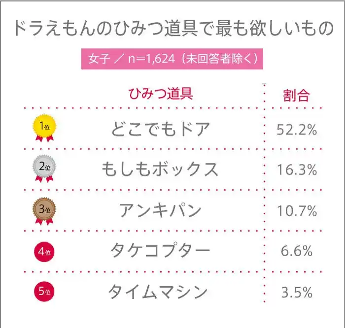 | 男女共通の1位になったのは、行きたい場所を想像して扉を開けるだけで、どこにでも行けるあの道具! | |||