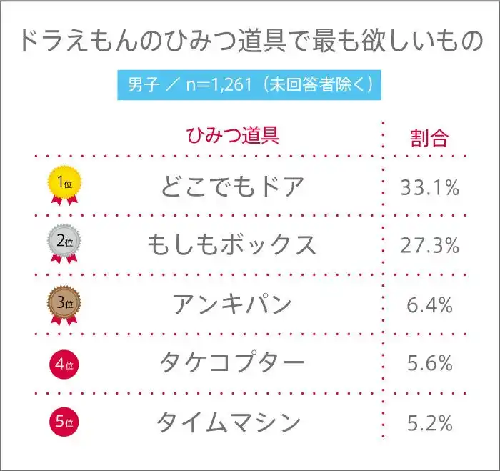 | 3位は、“アンキパン”、4位は“タケコプター”、5位は“タイムマシン”がランクインし、上位5位は、男女共通の結果でした。 | |||
