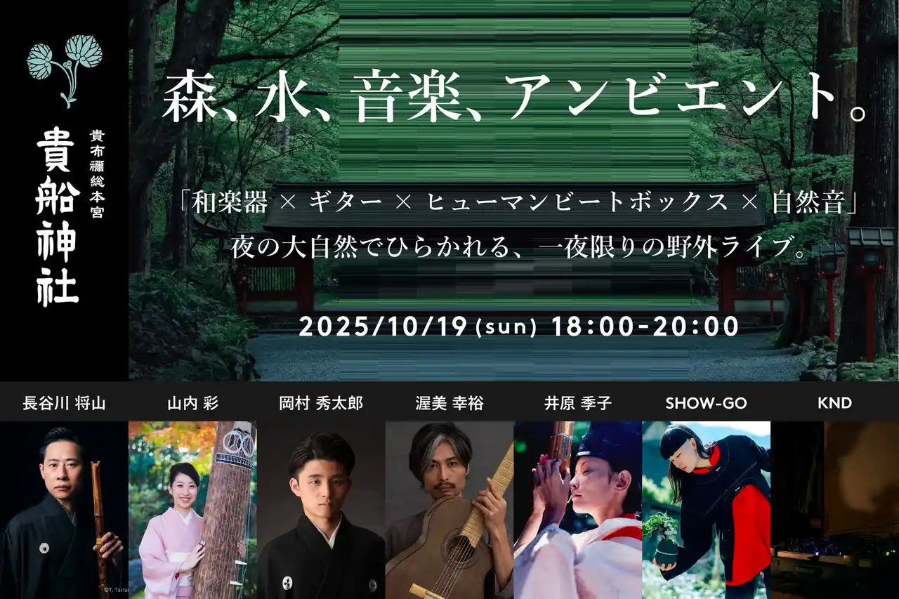 開催日時は2025年10月19日(日)18:00~20:00で、入場はチケット制です。通常は入ることのできない「夕暮れ~夜の時間帯」に、貴船神社の「奥宮」にて一夜限りの特別なライブが開かれます。 |