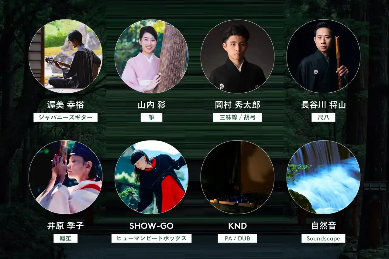 ジャパニーズギタリスト・渥美幸裕(以下、敬称略)が主宰する『邦楽二.〇』のメンバー4名に加えて、鳳笙演奏家・井原季子、ヒューマンビートボクサー・SHOW-GO、サウンドエンジニア・KNDにご出演いただき、計7名のアーティストが夜の大自然のなかでアンビエント・セッションを奏でます。 |