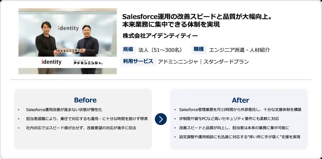 | 当社は、アドミンニンジャを中心に「Salesforce運用 × AI活用」の支援領域をさらに拡大し、企業の業務効率化と顧客接点改革を推進してまいります。 | |||
