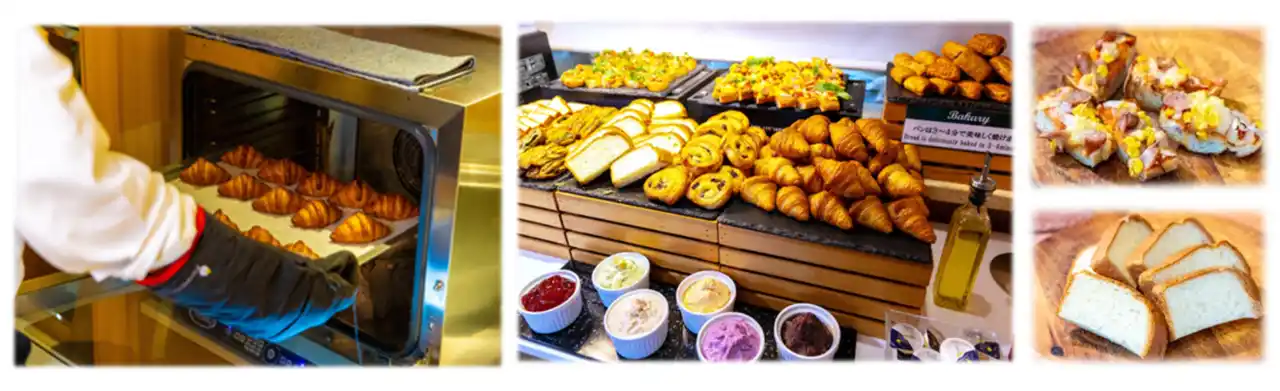 | ヨーロッパ最大手のベーカーリー「アリスタ社」から定番のクロワッサンをはじめ、総菜パンまで料理長が厳選しました。店内のオーブンで焼き上げており、焼きたて熱々のパンをお楽しみいただけます。また、スプレッドも料理長創作の「紅芋ペースト」や「アボガドマヨネーズ」など多数用意いたしました。お客さまの思いのままに自分だけの味で美味しくお楽しみいただけます。 | ||||||||||||||