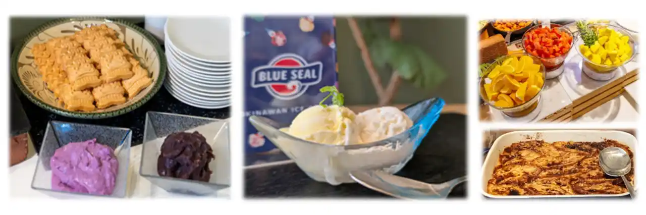 | 沖縄で魔除けや守護神として大切にされている獅子の像「シーサー」。そのシーサーの形をした最中をご用意いたしました。トッピングは「BLUE SEAL」のアイスクリームや紅芋餡、小豆餡からお選び頂けます。料理長のおススメは全部乗せ!ぜひ、お好みのスイーツをお楽しみください。その他にも、クロワッサンベースの「黒糖フレンチトースト」はとろっとろの食感で、自慢のスペシャルティコーヒーとのマリアージュをご堪能いただけます。 | ||||||||||||||